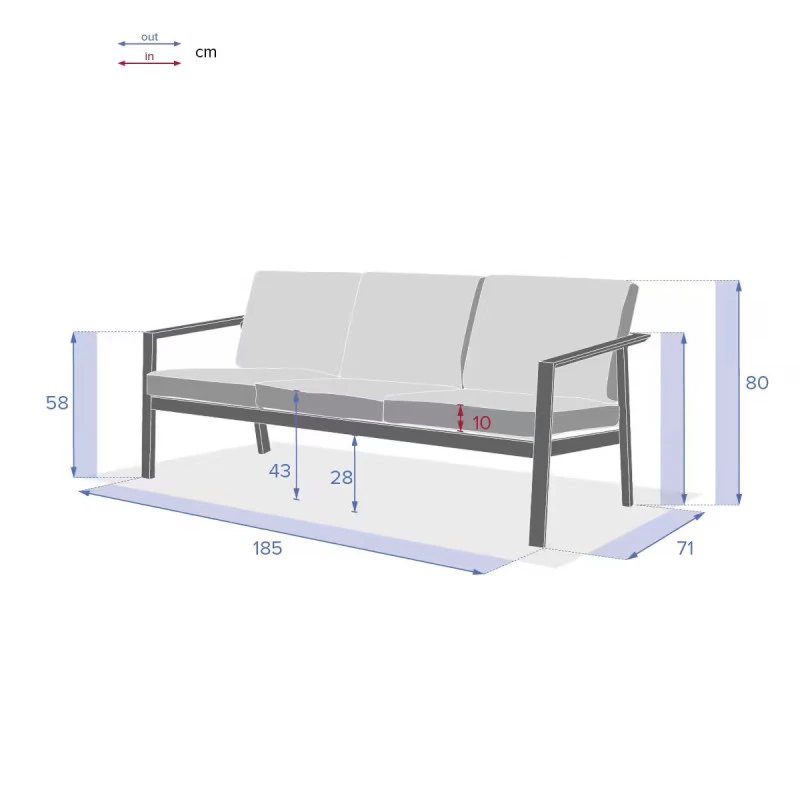 Sa haute résistance finira de vous convaincre : le canapé dispose d’une structure en aluminium traité époxy antirouille et de coussins d’assise en polyester 230 g/m² déhoussables et traités contre la décoloration.
