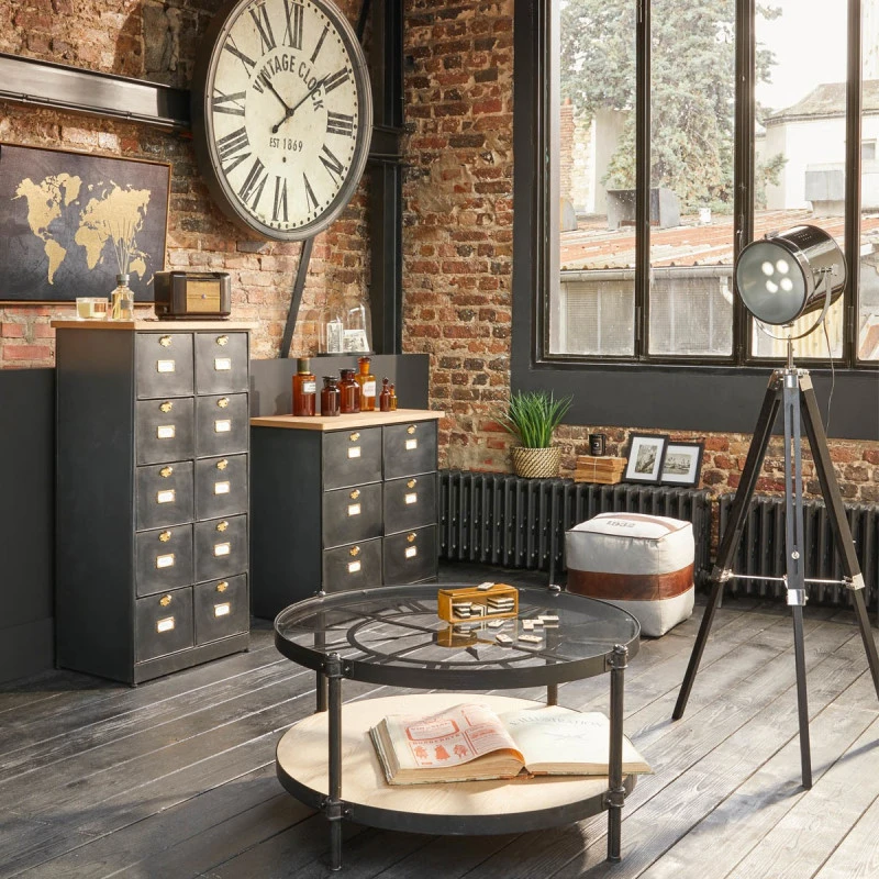 Commode Ă clapets dorĂ©s de la marque Atmosphera. Cette commode Ivan en bois et fer apportera une touche vintage Ă votre intĂ©rieur. Ces 10 clapets permettent un espace de rangement idĂ©al pour un meuble de bureau ou encore comme meuble d’entrĂ©e.Â