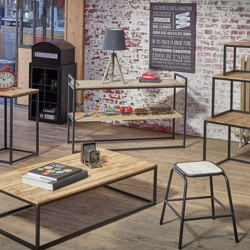 Console 2 étagères, cadre en métal de la marque Atmosphera. Cette console au style vintage et sobre s’adaptera aux décorations les plus simples et s’avérera des plus utiles pour avoir à porter de main ce dont vous avez besoin. L’association du coloris bois et noir mat est à la pointe de la dernière tendance.
