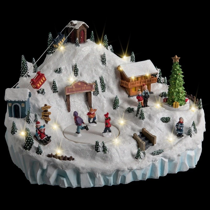 Village composé d’une montagne enneigée + téléphérique avec cabines + patineurs en mouvement.