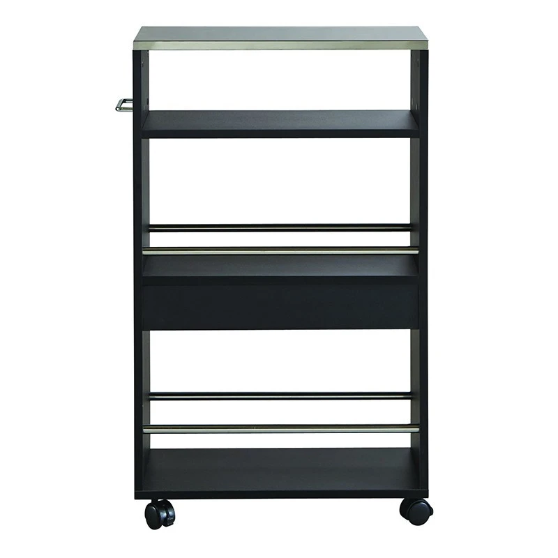 Desserte de cuisine noire sur 4 roues , idéale pour servir ou desservir la table. Ces 4 roues avec freins permettent de transporter facilement de nombreux éléments en toute sécurité. Équipée de 4 plateaux et d’un porte torchon, cette desserte offre de nouveaux espaces de rangement. Son dessus en inox lui confère un style résolument moderne et peut devenir la place idéale de la cafetière. Multi-usage, cette desserte peut également être utilisée dans une salle de bain. Desserte en panneaux de particules, épaisseur : 15 mm. Revêtement mélamine. Finition BRILLANT. Dessus inox. Porte torchon : Longueur de la poignée : 11 cm. Livrée en kit, à monter soi-même.