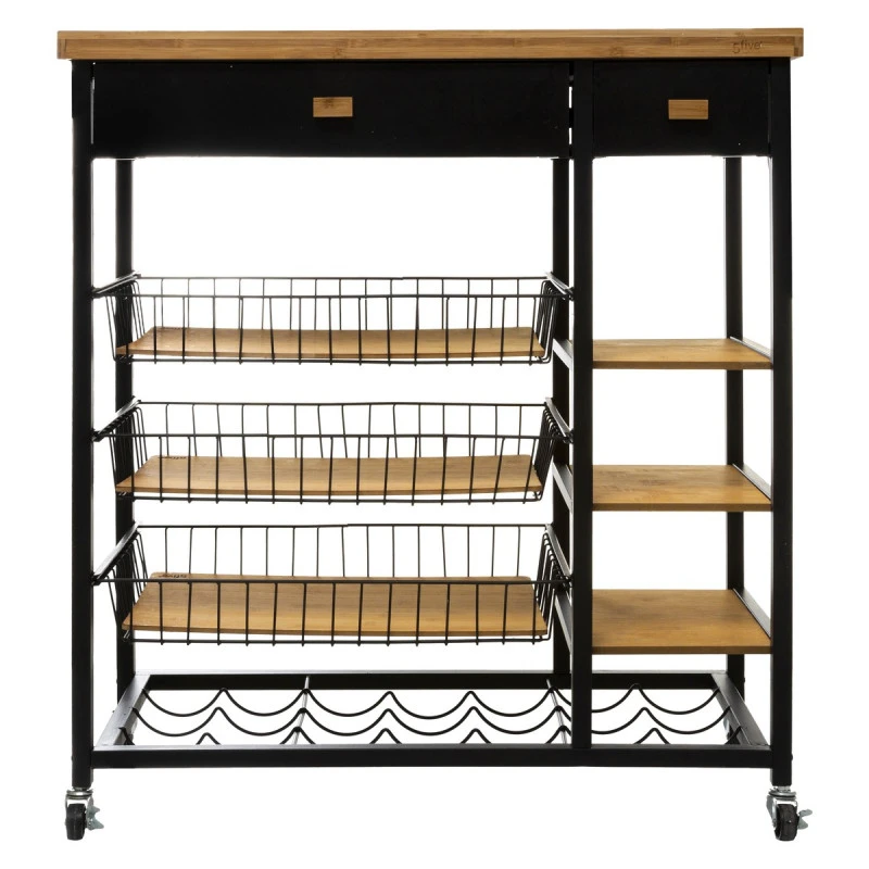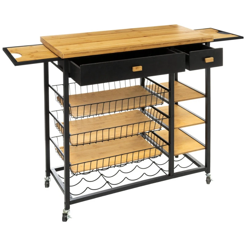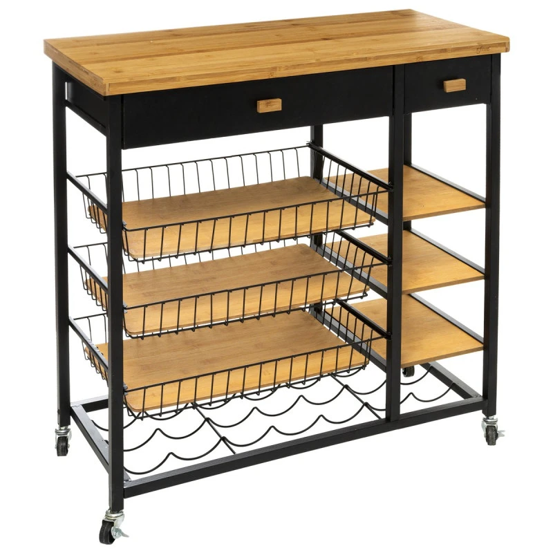 En bambou et métal, elle propose de nombreux rangements : 2 tiroirs + 3 paniers en métal + 3 étagères + 1 support à bouteilles.