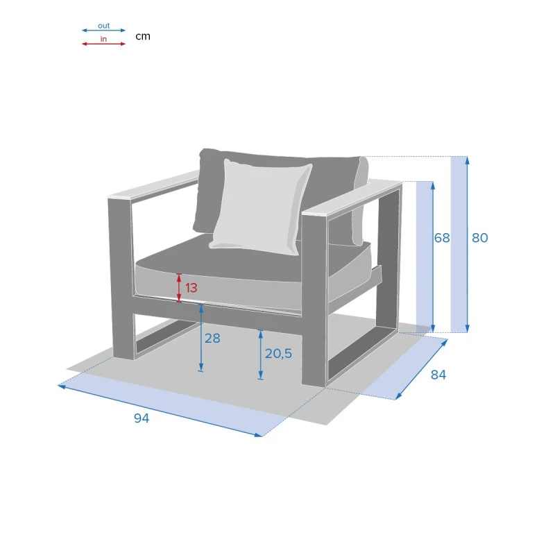 La structure est en aluminium traité époxy antirouille. Les coussins polyester 275 g/m² sont déhoussables pour un entretien facile et traités déperlants permettant à l’eau de glisser sans pénétrer dans la matière.