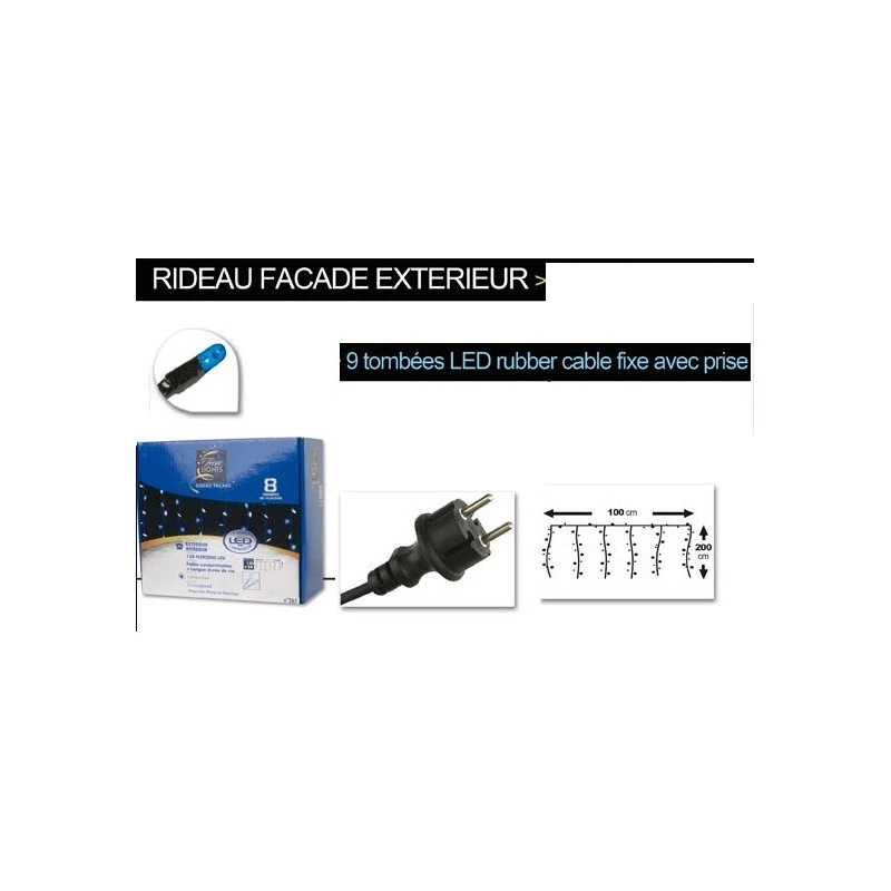 Guirlande pour l’extérieur et l’intérieur composée d’un fil de 100 cm de long à poser horizontalement sur lequel sont accrochées 9 tombées de lumière de 200 cm de hauteur + cordon d’alimentation de 1.5 cm de long. 171 ampoules Leds forte luminosité. Lumière fixe. Fil noir, ampoules bleues. Se branche sur le secteur grâce au transformateur fourni.
