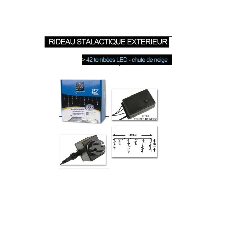 Guirlande pour l’extĂ©rieur et l’intĂ©rieur composĂ©e d’un fil de 410 cm de long Ă poser horizontalement sur lequel sont accrochĂ©es 42 tombĂ©es de lumière de hauteurs diffĂ©rentes, effet stalactite (hauteur maximale 36 cm) + cordon d’alimentation de 800 cm de long.Â