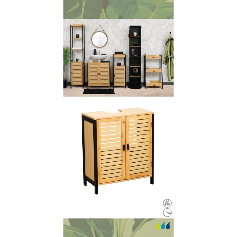 Ce meuble sous lavabo en bambou et MDF dispose d’une étagère intérieure.