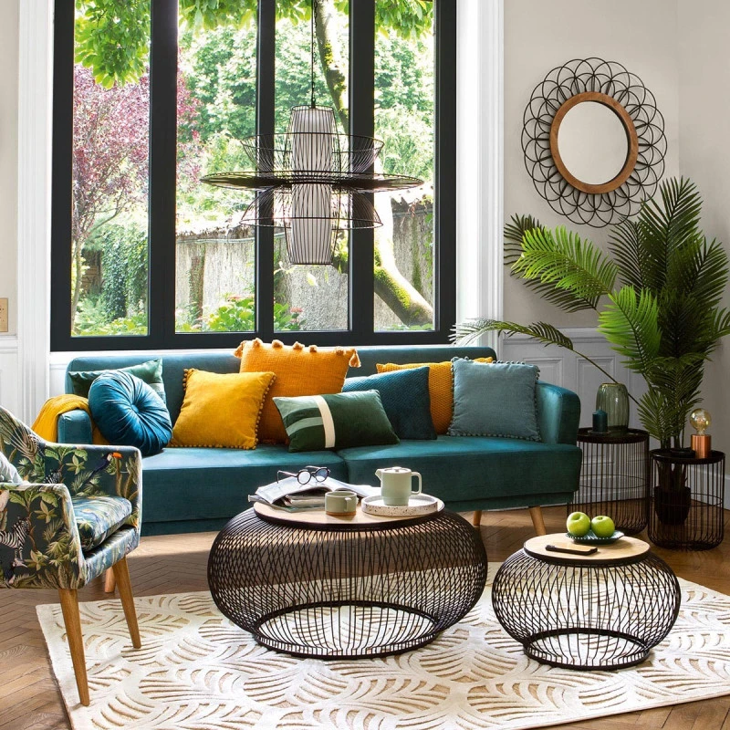 Cet ensemble apportera un style industriel très tendance à votre salon grâce à sa structure filaire noir et son plateau en bois massif. Ne nécessite pas de montage.