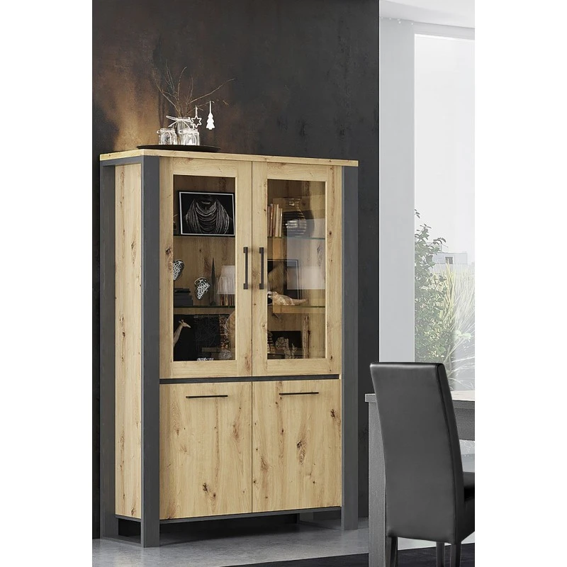 La vitrine Eden se compose d’une partie supérieure avec 2 portes vitrées et d’une partie inférieure avec 2 portes pleines.